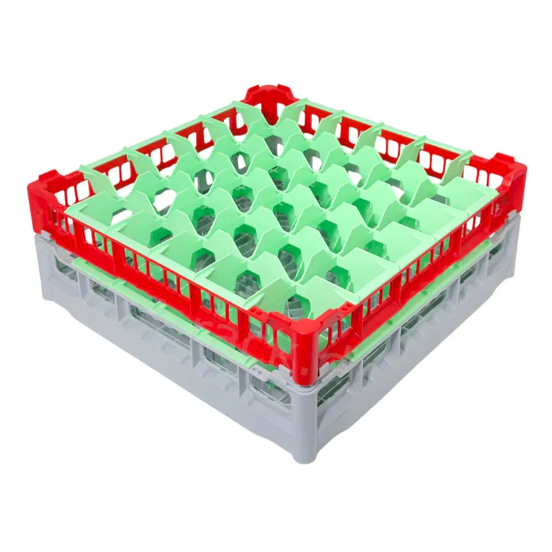 Der Gläserkorb ist modular aufgebaut und kann einfach an geänderte Anforderungen angepasst werden, indem Eckverbindungen, Rahmen, Zwischenrahmen oder Fachungen ausgetauscht werden. Dadurch kann die Glashöhe oder Gläserkapazität je nach Bedarf angepasst werden. Falls Sie diese Teile benötigen, können Sie diese separat bei uns erwerben. Bei Fragen stehen wir Ihnen gerne zur Verfügung. Dieses Gläserrack besteht aus langlebigem, strapazierfähigem und lebensmittelechtem PP-Polypropylen-Kunststoff. Polypropylen ist frei von hormonell wirksamen Substanzen wie BPA und enthält keine Weichmacher wie Phthalate.