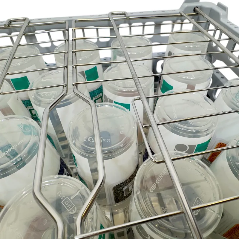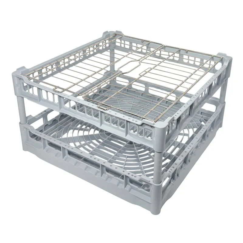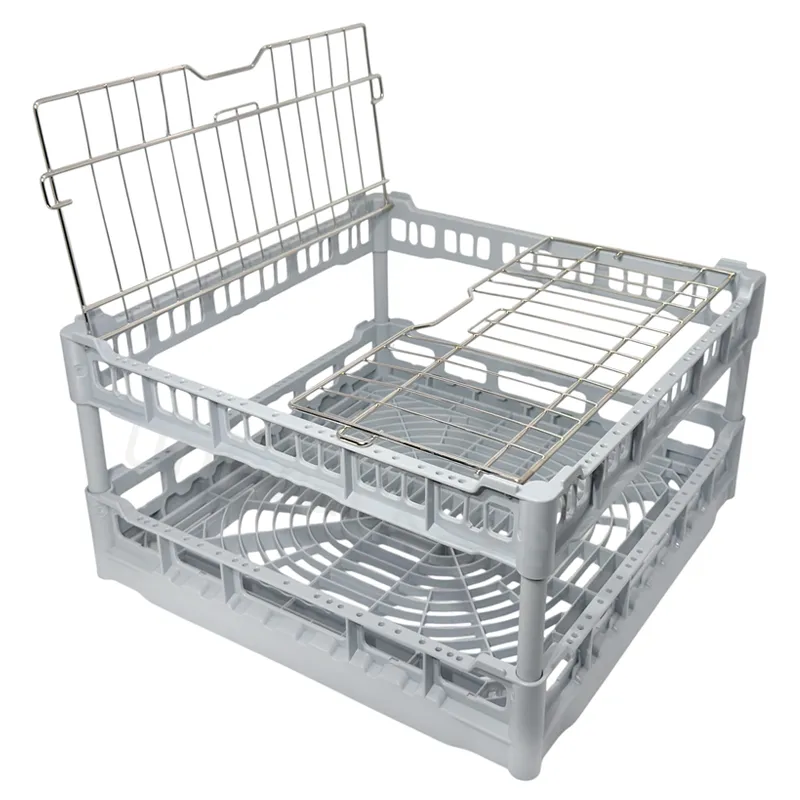 Durchbrochener gewerblicher Kunststoff-Spülgrundkorb für leichtes Spülgut wie z.B. Kunststofftassen, Mehrwegschüsseln/Bowls, Mehrwegcups/Becher oder Küchenutensilien. Durch den weitmaschigen Boden und das Efficient-Wash-Design+ wird eine optimale Wasserverteilung erreicht - für hygienisch sauberes Spülgut. Der im Oberrahmen integrierte Edelstahlgitter-Klappdeckel beschwert das Spülgut optimal und hält es an seinem Platz - für effizientes Arbeiten mit Zeitgewinn. Stapelbar mit den Körben Typ NK, UK und P-18-12.