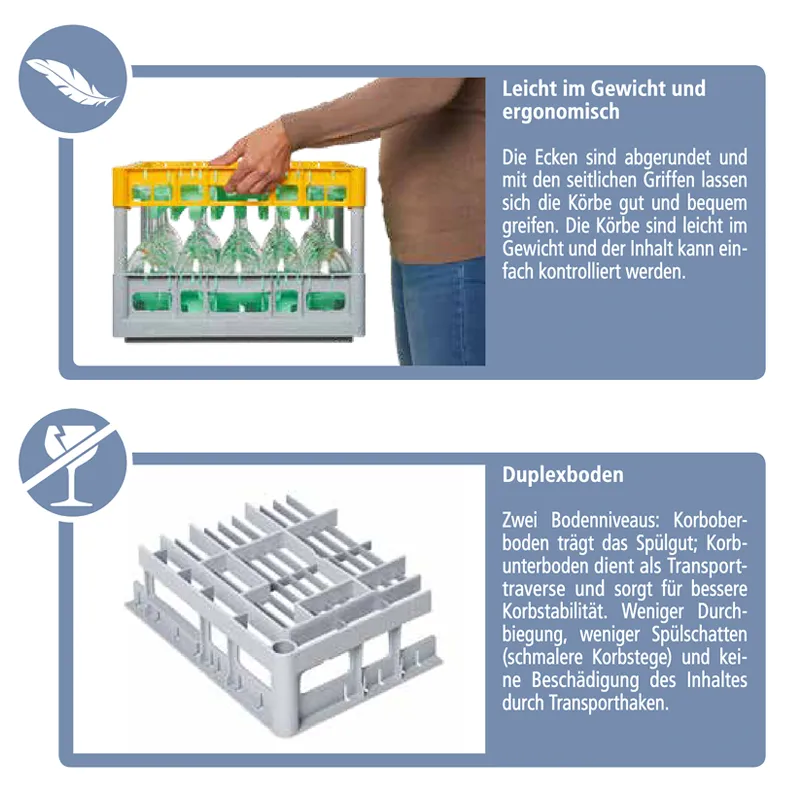 Hoher Tragekomfort durch ergonomische Konstruktion und leichte Bauweise. Stapelbar, teilweise auch mit anderen 60x40 cm Körben, wie z.B. Bäcker- oder Metzgerbehälter. Perfekte Spülergebnisse durch die offene Konstruktion und optimaler Wasserverteilung beim Spülvorgang durch das Efficient-Wash-Design+. Auf Wunsch kann der Gläserkorb mit Einzelbuchstaben oder einem Logo individuell beschriftet werden. Bitte stellen Sie eine separate Anfrage, falls Sie diese Option wünschen. Nutzen Sie hierfür gerne unser Kontaktformular.