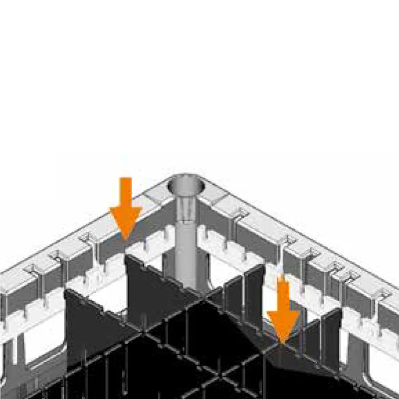 In Verbindung mit den Längs- und Querteilern (Typ LT-PP-560 und LT-PP-365) lassen sich im 15-mm-Raster individuelle Fachungen und Einteilungen erstellen, die mit diesem Adapter am Korb CR-600 oder am Toprahmen fixiert werden können.